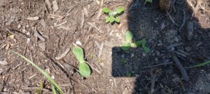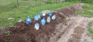 Ensuite, opération plantation : courgettes, butternut et potiron ont pris place dans la terre, prêtes à conquérir le potager. Mais attention, les gelées de mai rôdent encore ! J’ai donc sorti mon arme secrète : les grosses bouteilles d’eau de 5 litres, recyclées en mini-serres dignes des plus grands inventeurs. 🧊🥒🎩